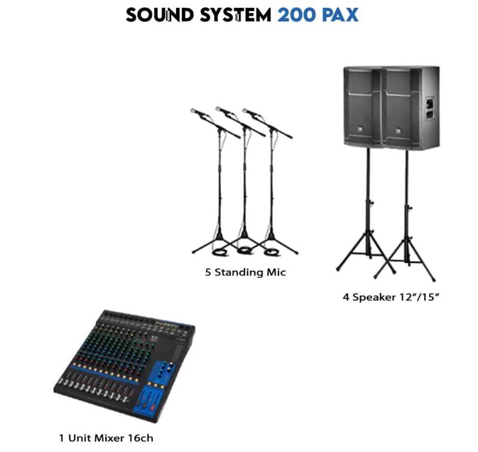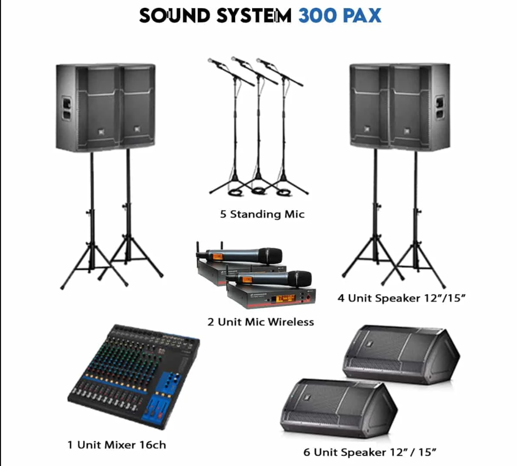 adalah paket dengan 1 pasang speaker control 1000 watt 15″ X2 berikut 3 microphone dan 1 mixer yamaha,