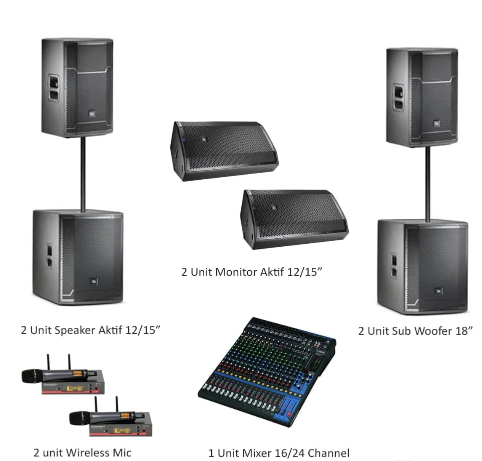 adalah paket dengan 1 pasang speaker control 1000 watt 1 pasang speaker FOH 1000 watt 1 pasang FOH subwoofer total 3000 watt berikut 5 microphone dan 1 mixer yamaha,